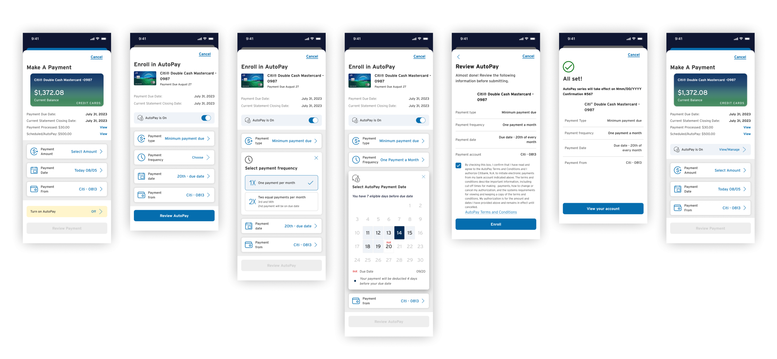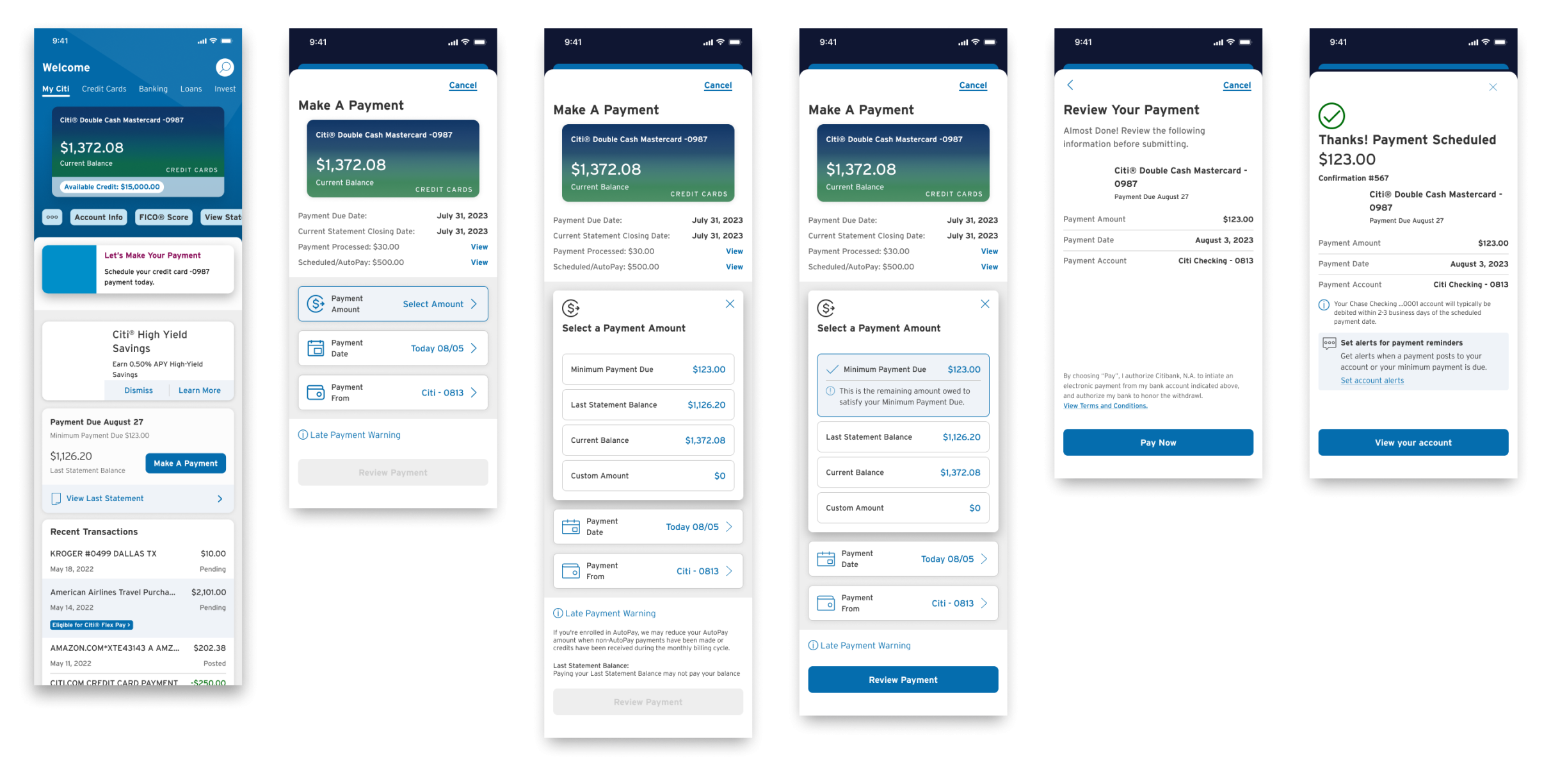The one exception was the credit card pay flow. For various business reasons, leadership was concerned that updating this flow could create risk for Citi’s largest revenue stream if development could not be executed simultaneously across both desktop and app. As a result, the credit card experience was left untouched at that time – despite being one of the most critical journeys for users.